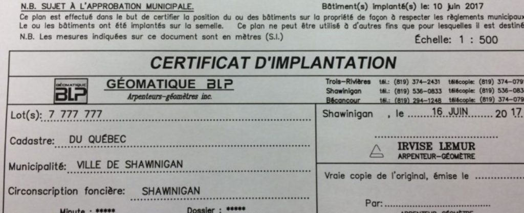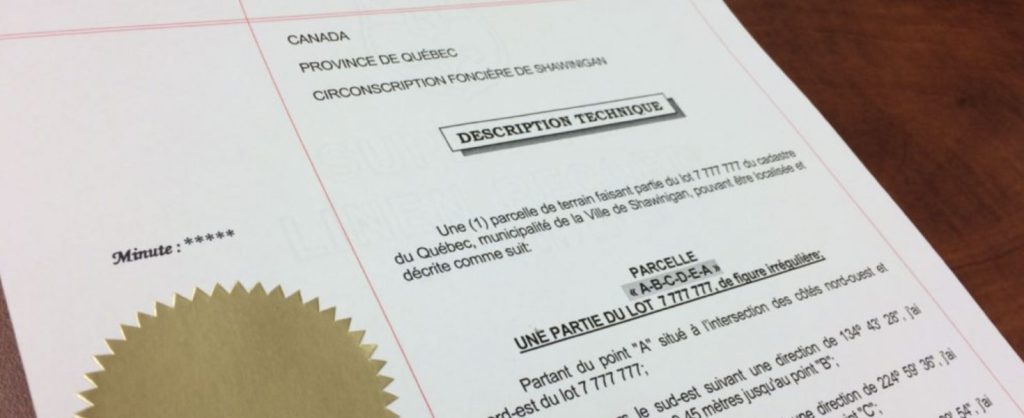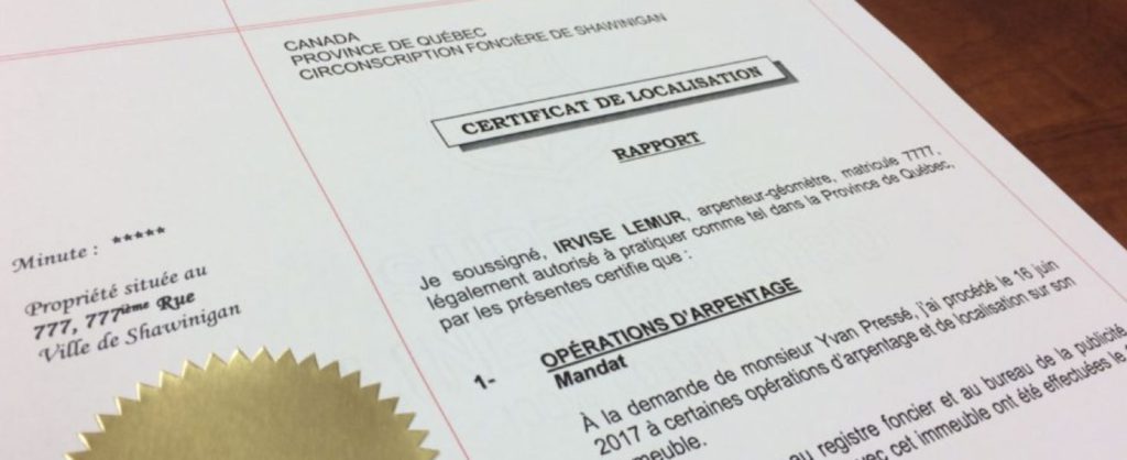 Le certificat de localisation est généralement nécessaire lors d’une transaction immobilière ou d’un refinancement hypothécaire. Le certificat est composé d’un rapport et d’un plan offrant l’opinion de l’arpenteur-géomètre sur la conformité de plusieurs éléments ainsi que sur les limites de propriété. Ce document est régi en vertu du Règlement sur la norme de pratique relative au certificat de localisation de la Loi sur les arpenteurs-géomètres.