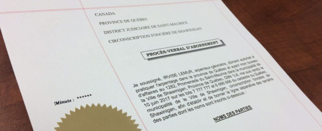 Opération visant à délimiter les limites d’une propriété ou un droit démembré (ex :servitude) à l’aide de repères d’arpentage.